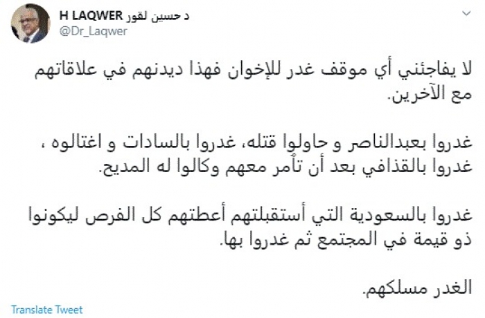وقال في تغريدة عبر "تويتر" رصدها "المشهد العربي": "لا يفاجئني أي موقف غدر للإخوان فهذا ديدنهم في علاقاتهم مع الآخرين".