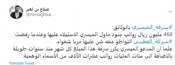 وقال في تغريدة عبر "تويتر" رصدها "المشهد العربي": "سرقة الميسري بالوثائق: 468 مليون ريال رواتب جنود حاول الميسري الاستيلاء عليها وعندما رفضت شركة القطيبي التواطؤ معه شن عليها حربًا شعواء".