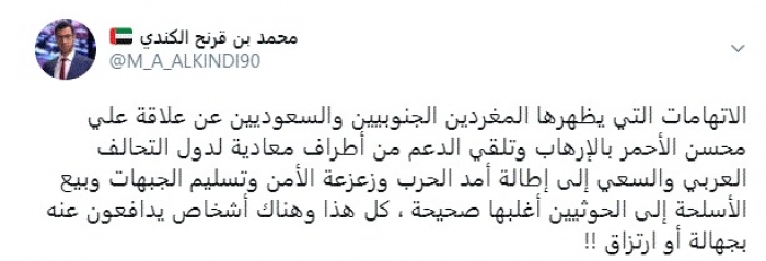 وكتب في تغريدة عبر "تويتر" رصدها "المشهد العربي": "الاتهامات التي يظهرها المغردون الجنوبيون والسعوديون عن علاقة علي محسن الأحمر بالإرهاب وتلقي الدعم من أطراف معادية لدول التحالف العربي، والسعي إلى إطالة أمد الحرب وزعزعة الأمن وتسليم الجبهات وبيع الأسلحة للحوثيين أغلبها صحيحة، كل هذا وهناك أشخاص يدافعون عنه بجهالة أو ارتزاق".