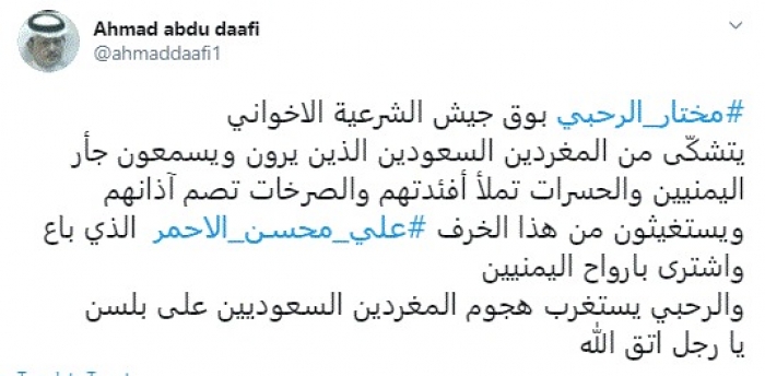 وقال في تغريدة عبر "تويتر" رصدها "المشهد العربي": "مختار الرحبي بوق جيش الشرعية الإخواني يتشكى من المغردين السعوديين الذين يرون ويسمعون جأر اليمنيين والحسرات تملأ أفئدتهم والصرخات تصم آذانهم ويستغيثون من هذا الخرف علي محسن الأحمر الذي باع واشترى بأرواح اليمنيين".