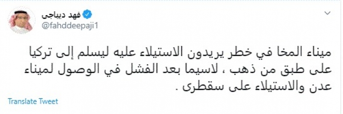 وقال في تغريدة عبر "تويتر" رصدها "المشهد العربي": "ميناء المخا في خطر يريدون الاستيلاء عليه ليسلم إلى تركيا على طبق من ذهب، لاسيما بعد الفشل في الوصول لميناء عدن والاستيلاء على سقطرى".