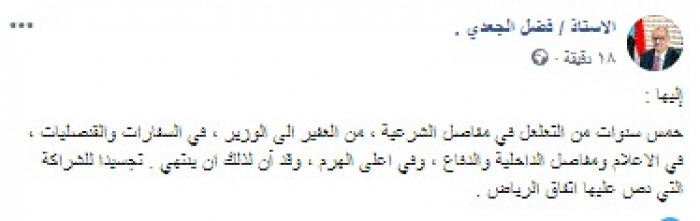 وقال في منشور عبر "فيس بوك" رصده "المشهد العربي": "خمس سنوات من التغلغل في مفاصل الشرعية، من الغفير إلى الوزير، في السفارات والقنصليات، في الإعلام ومفاصل الداخلية والدفاع، وفي أعلى الهرم".