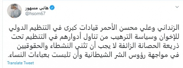 وكتب في تغريدة عبر "تويتر" رصدها "المشهد العربي": "الزنداني وعلي محسن الأحمر قيادات كبرى في التنظيم الدولي للإخوان".