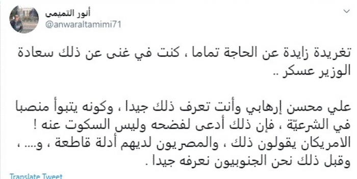 علق الكاتب والمحلل العسكري أنور التميمي، اليوم، على دفاع وزير حقوق الإنسان اليمني محمد عسكر عن الإرهابي علي محسن الأحمر.