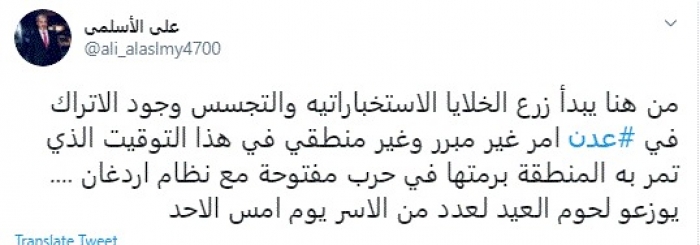 وكتب في تغريدة عبر "تويتر" رصدها "المشهد العربي": "من هنا يبدأ زرع الخلايا الاستخباراتية والتجسس وجود الأتراك في عدن أمر غير مبرر وغير منطقي في هذا التوقيت الذي تمر به المنطقة برمتها في حرب مفتوحة مع نظام أردوغان .... يوزعوا لحوم العيد لعدد من الأسر يوم أمس الأحد".