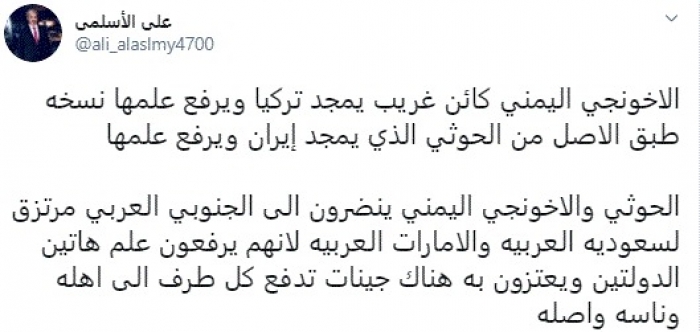 وقال في تغريدة عبر "تويتر" رصدها "المشهد العربي": "الإخونجي اليمني كائن غريب يمجد تركيا ويرفع علمها نسخه طبق الأصل من الحوثي الذي يمجد إيران ويرفع علمها".