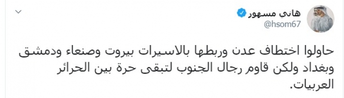 وكتب عبر تغريدة له على "تويتر" رصدها "المشهد العربي": "حاولوا اختطاف عدن وربطها بالأسيرات بيروت وصنعاء ودمشق وبغداد ولكن قاوم رجال الجنوب لتبقى حرة بين الحرائر العربيات".