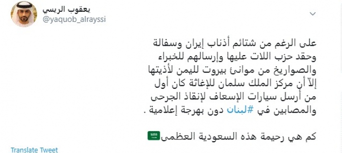 وأضاف: "إلاّ أن مركز الملك سلمان للإغاثة كان أول من أرسل سيارات الإسعاف لإنقاذ الجرحى والمصابين في لبنان دون بهرجة إعلامية".