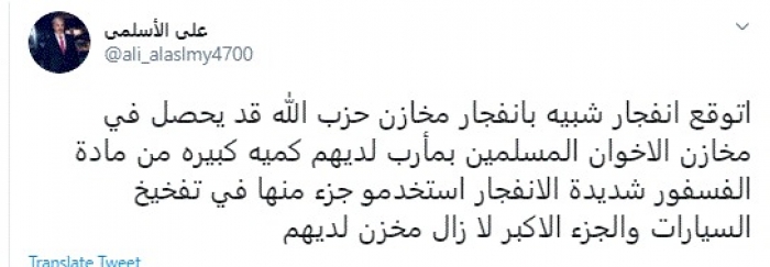 توقع الناشط السياسي علي الأسلمي، اليوم، حدوث انفجار مماثل لما حدث في بيروت بمخازن جماعة الإخوان في مأرب، وذلك جراء وجود كمية كبيرة من مادة الفوسفور شديدة الانفجار.