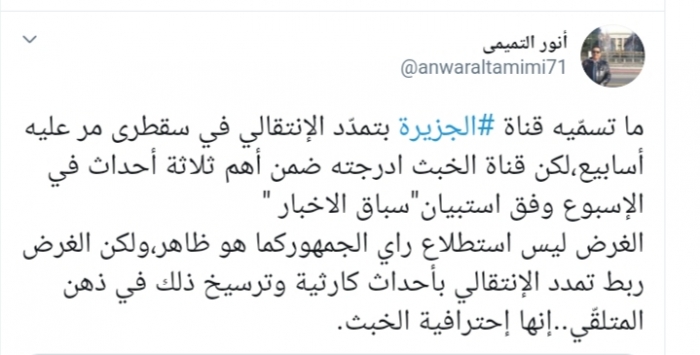 وكتب عبر تغريدة له على "تويتر" رصدها "المشهد العربي": "ما تسمّيه قناة الجزيرة بتمدّد الانتقالي في سقطرى مر عليه أسابيع، لكن قناة الخبث أدرجته ضمن أهم ثلاثة أحداث في الأسبوع وفق استبيان "سباق الأخبار"، الغرض ليس استطلاع رأي الجمهور كما هو ظاهر، ولكن الغرض ربط تمدد الانتقالي بأحداث كارثية وترسيخ ذلك في ذهن المتلقّي، إنها احترافية الخبث".
