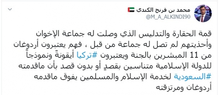 وكتب عبر تغريدة له على "تويتر" رصدها " المشهد العربي": "قمة الحقارة والتدليس الذي وصلت له جماعة الإخوان وأحذيتهم لم تصل له جماعة من قبل، فهم يعتبرون أردوغان من 11 المبشرين بالجنة ويعتبرون تركيا أيقونةً ونموذجًا للدولة الإسلامية متناسين بقصدٍ أو بدون قصد بأن ماقدمته السعودية لخدمة الإسلام والمسلمين يفوق ما قدمه أردوغان ومرتزقته".