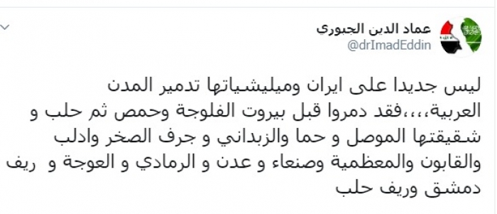 وكتب عبر تغريدة له على "تويتر" رصدها " المشهد العربي": "ليس جديدًا على إيران ومليشياتها تدمير المدن العربية، فقد دمروا قبل بيروت الفلوجة وحمص ثم حلب و شقيقتها الموصل و حما والزبداني و جرف الصخر وأدلب والقابون والمعظمية وصنعاء و عدن و الرمادي و العوجة و ريف دمشق وريف حلب".