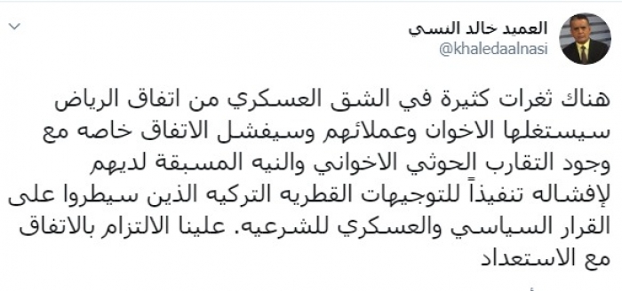 وكتب عبر تغريدة له على "تويتر" رصدها " المشهد العربي":"هناك ثغرات كثيرة في الشق العسكري من اتفاق الرياض سيستغلها الإخوان وعملائهم وسيفشل الاتفاق خاصة مع وجود التقارب الحوثي الإخواني والنية المسبقة لديهم لإفشاله تنفيذًا للتوجيهات القطرية التركية الذين سيطروا على القرار السياسي والعسكري للشرعية، علينا الالتزام بالاتفاق مع الاستعداد".