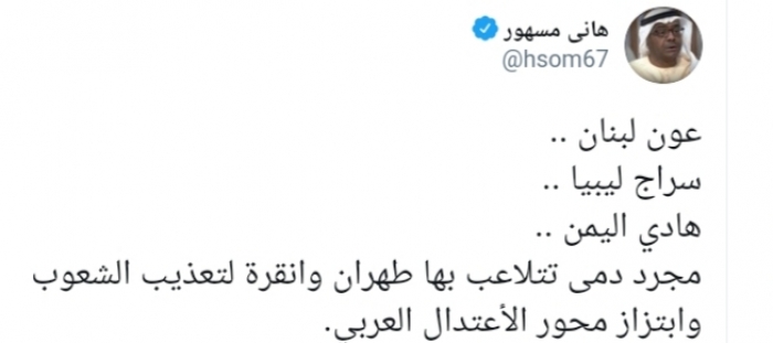 وكتب عبر تغريدة له على "تويتر" رصدها " المشهد العربي":"عون لبنان، سراج ليبيا، هادي اليمن، مجرد دمى تتلاعب بها طهران وأنقرة لتعذيب الشعوب وابتزاز محور الاعتدال العربي".
