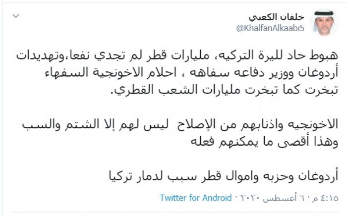وكتب "الكعبي" في تغريدة بتويتر، رصدها "المشهد العربي" قال فيها: "هبوط حاد لليرة التركية، مليارات قطر لم تجد نفعا، وتهديدات أردوغان ووزير دفاعه سفاهة، أحلام الإخونجية السفهاء تبخرت كما تبخرت مليارات الشعب القطري".