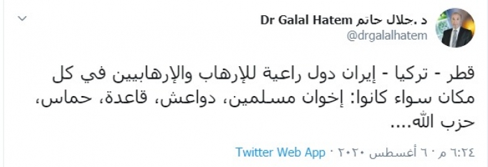 وكتب "حاتم" تغريدة بتويتر، رصدها "المشهد العربي": "قطر - تركيا - إيران دول راعية للإرهاب والإرهابيين في كل مكان سواء كانوا: إخوان مسلمين، دواعش، قاعدة، حماس، حزب الله".