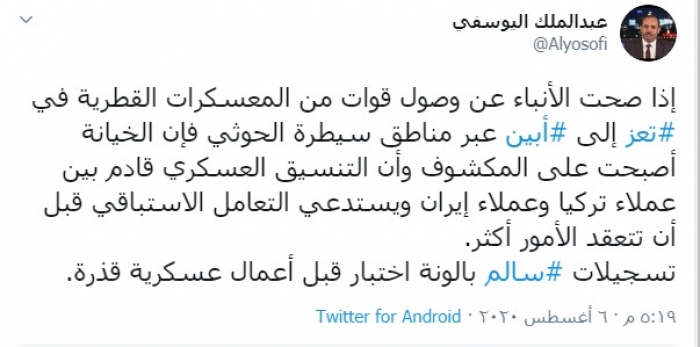 وكتب "اليوسفي" تغريدة عبر حسابه بتويتر، رصدها "المشهد العربي": "إذا صحت الأنباء عن وصول قوات من المعسكرات القطرية في #تعز إلى #أبين عبر مناطق سيطرة الحوثي فإن الخيانة أصبحت على المكشوف وأن التنسيق العسكري قادم بين عملاء تركيا وعملاء إيران ويستدعي التعامل الاستباقي قبل أن تتعقد الأمور أكثر".