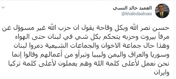 وكتب عبر تغريدة له على "تويتر" رصدها "المشهد العربي": "حسن نصر الله وبكل وقاحة يقول إن حزب الله غير مسؤول عن مرفأ بيروت وحزبه يتحكم بكل شيء في لبنان حتى الهواء، وهذا حال جماعة الإخوان والجماعات الشيعية دمروا لبنان وسوريا والعراق واليمن وليبيا وتبرأوا من أعمالهم وقالوا إنما نحن نعمل لإعلاء كلمة الله وهم يعملون لإعلاء كلمة تركيا وإيران".