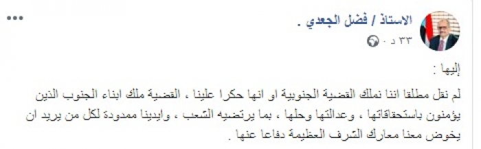 الجعدي: قضية الجنوب ملك لأبنائها.. وأيدينا ممدودة للجميع