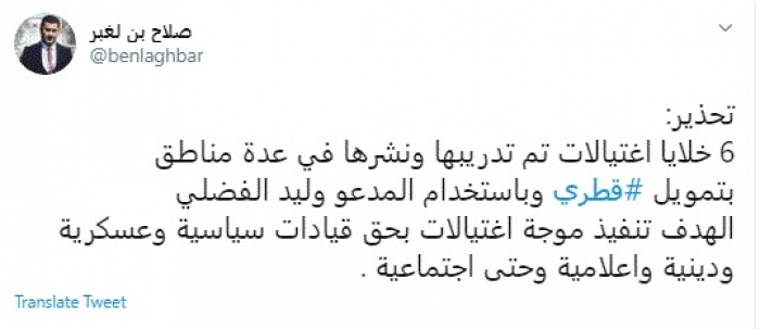 وقال في تغريدة عبر "تويتر" رصدها "المشهد العربي": "تحذير:6 خلايا اغتيالات تم تدريبها ونشرها في عدة مناطق بتمويل قطري وباستخدام المدعو وليد الفضلي".