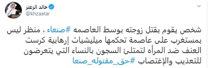 علق المحلل السياسي السعودي خالد الزعتر، اليوم، على واقعة قتل شخص لزوجته في صنعاء، مؤكدًا أن مليشيات الحوثي الإرهابية كرست العنف ضد المرأة.