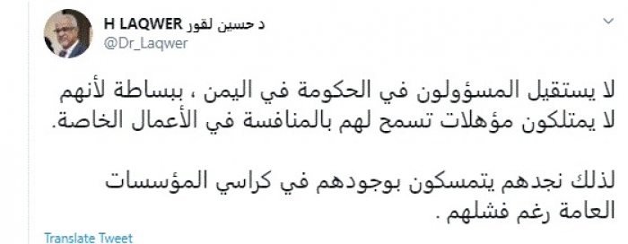 وقال في تغريدة عبر "تويتر" رصدها "المشهد العربي": "لا يستقيل المسؤولون في الحكومة في اليمن، ببساطة لأنهم لا يمتلكون مؤهلات تسمح لهم بالمنافسة في الأعمال الخاصة".