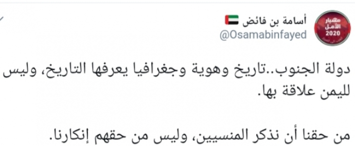وكتب عبر تغريدة له على "تويتر" رصدها "المشهد العربي": "دولة الجنوب، تاريخ وهوية وجغرافيا يعرفها التاريخ، وليس لليمن علاقة بها، من حقنا أن نذكر المنسيين، وليس من حقهم إنكارنا".