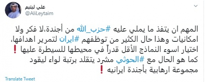 وقال في تغريدة عبر "تويتر" رصدها "المشهد العربي": "المهم أن ينفذ ما يملي عليه حزب الله من أجندة، لا فكر ولا إمكانيات وهذا حال الكثير من توظفهم إيران لتمرير أهدافها، اختيار أسوأ النماذج الأقل قدرًا في محيطها للسيطرة عليها".