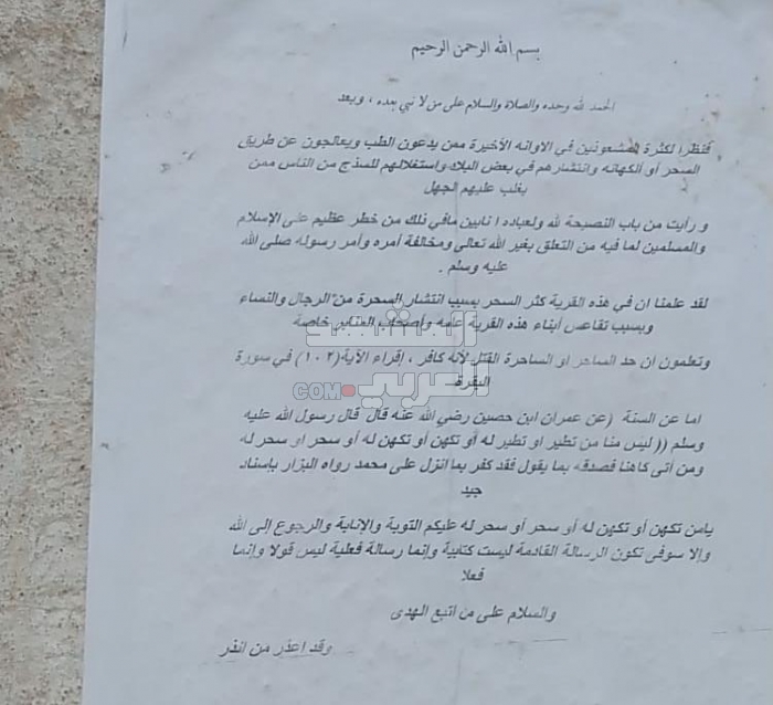 وحذرت المنشورات، التي وزعتها جهات مجهولة، أهالي القرية من السحر والشعوذة، وتضمنت عدة أحاديث من السيرة النبوية عن تكفير المشعوذين.