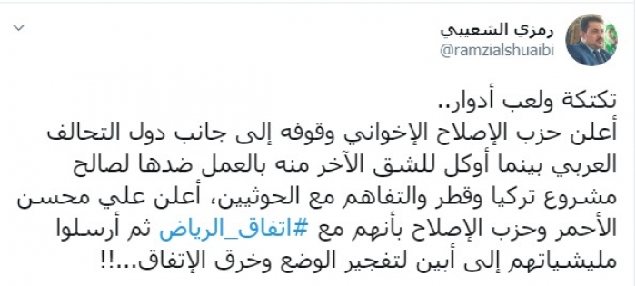 وكتب عبر تغريدة له على "تويتر" رصدها "المشهد العربي": "تكتكة ولعب أدوار.. أعلن حزب الإصلاح الإخواني وقوفه إلى جانب دول التحالف العربي بينما أوكل للشق الآخر منه العمل ضدها لصالح مشروع تركيا وقطر والتفاهم مع الحوثيين، أعلن علي محسن الأحمر وحزب الإصلاح أنهم مع اتفاق الرياض ثم أرسلوا مليشياتهم إلى أبين لتفجير الوضع وخرق الاتفاق".