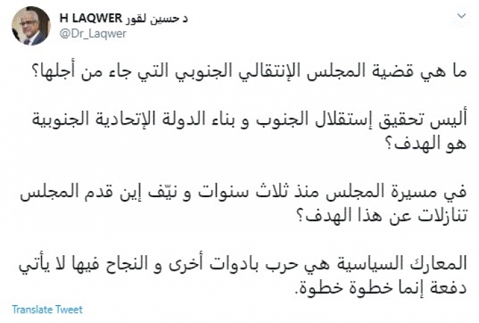 لقور: الانتقالي هدفه استقلال الجنوب.. وتحقيق النجاح يأتي خطوة بخطوة