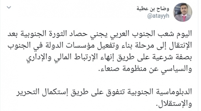 وكتب عبر تغريدة له على "تويتر" رصدها "المشهد العربي": "اليوم شعب الجنوب العربي يجني حصاد الثورة الجنوبية بعد الانتقال إلى مرحلة بناء وتفعيل مؤسسات الدولة في الجنوب بصفة شرعية على طريق إنهاء الارتباط المالي والإداري والسياسي عن منظومة صنعاء".