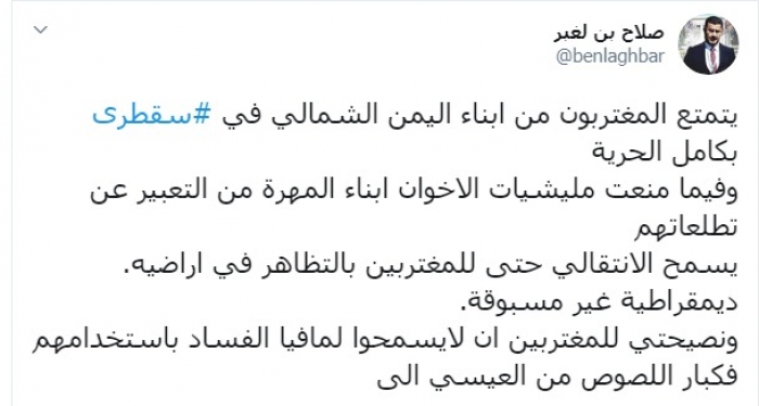 أكد الإعلامي صلاح بن لغبر، اليوم الثلاثاء، أن أبناء الشمال في سقطرى يتمتعون بكامل حريتهم، مطالبًا إياهم بعدم السماح لمافيا الفساد باستخدامهم.