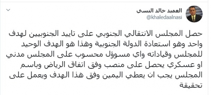 وكتب عبر تغريدة له على "تويتر" رصدها "المشهد العربي": "حصل المجلس الانتقالي الجنوبي على تأييد الجنوبيين لهدف واحد وهو استعادة الدولة الجنوبية وهذا هو الهدف الوحيد للمجلس وقياداته وأي مسؤول محسوب على المجلس مدني أو عسكري يحصل على منصب وفق اتفاق الرياض وباسم المجلس يجب أن يعطي اليمين وفق هذا الهدف ويعمل على تحقيقه".