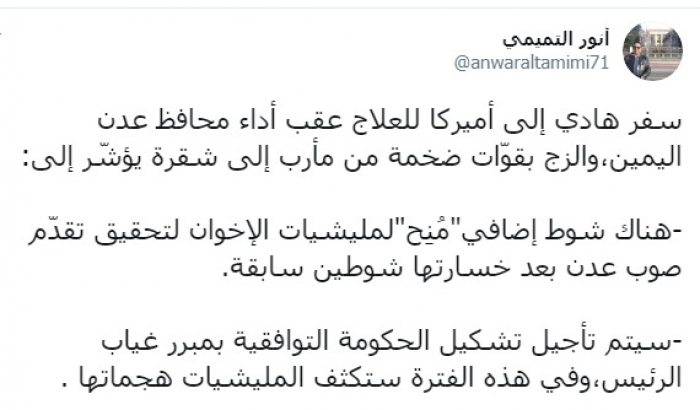 وكتب عبر تغريدة له على "تويتر" رصدها "المشهد العربي": "سفر هادي إلى أميركا للعلاج عقب أداء محافظ عدن اليمين، والزج بقوّات ضخمة من مأرب إلى شقرة يؤشّر إلى أن، هناك شوطا إضافيا "مُنِح" لمليشيات الإخوان لتحقيق تقدّم صوب عدن بعد خسارتها شوطين سابقين، سيتم تأجيل تشكيل الحكومة التوافقية بمبرر غياب الرئيس، وفي هذه الفترة ستكثف المليشيات هجماتها".