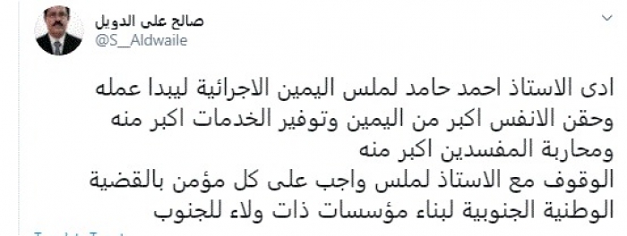 وقال في تغريدة عبر "تويتر" رصدها "المشهد العربي": "أدى الأستاذ أحمد حامد لملس اليمين الإجرائية ليبدأ عمله وحقن الأنفس أكبر من اليمين وتوفير الخدمات أكبر منه ومحاربة المفسدين أكبر منه".