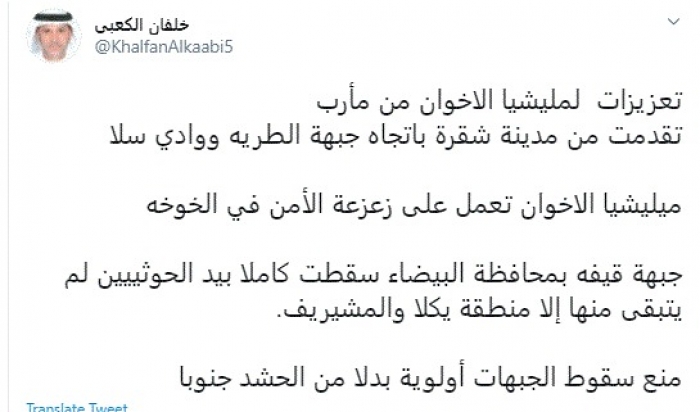 وقال في تغريدات عبر "تويتر" رصدها "المشهد العربي": "تعزيزات لمليشيا الإخوان من مأرب تقدمت من مدينة شقرة باتجاه جبهة الطرية ووادي سلا".