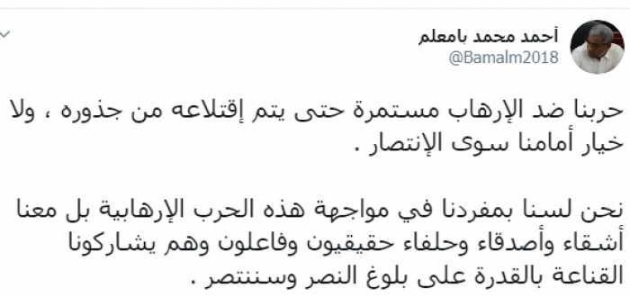 بامعلم: حرب الجنوب ضد الإرهاب مستمرة..ولا خيار سوى الانتصار