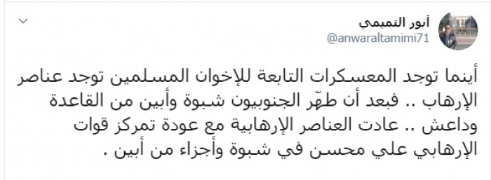 وكتب عبر تغريدة له على "تويتر" رصدها " المشهد العربي": "أينما توجد المعسكرات التابعة للإخوان المسلمين توجد عناصر الإرهاب، فبعد أن طهّر الجنوبيون شبوة وأبين من القاعدة وداعش، عادت العناصر الإرهابية مع عودة تمركز قوات الإرهابي علي محسن في شبوة وأجزاء من أبين".