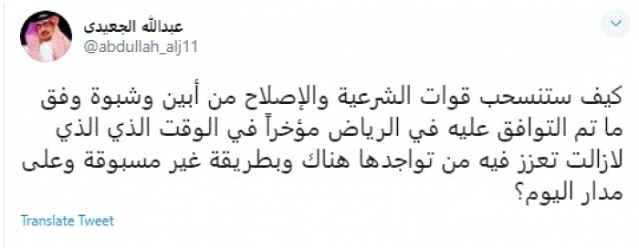 وقال في تغريدة عبر "تويتر" رصدها "المشهد العربي": "كيف ستنسحب قوات الشرعية والإصلاح من أبين وشبوة وفق ما تم التوافق عليه في الرياض مؤخرًا في الوقت الذي لازالت تعزز فيه من تواجدها هناك وبطريقة غير مسبوقة وعلى مدار اليوم؟".