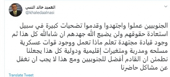 وقال في تغريدة عبر "تويتر" رصدها "المشهد العربي": "الجنوبيون عملوا واجتهدوا وقدموا تضحيات كبيرة في سبيل استعادة حقوقهم ولن يضيع الله جهدهم إن شاء الله كل هذا ثم وجود قيادة مجتهدة تعلم ماذا تعمل ووجود قوات عسكرية مسلحة ومدربة ومتغيرات إقليمية ودولية".