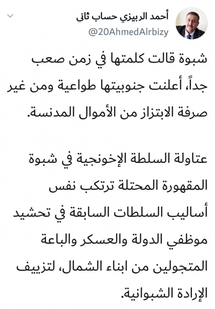وكتب "الربيزي" في تغريدة عبر حسابه الشخصي بتويتر رصدها "المشهد العربي": "شبوة قالت كلمتها في زمن صعب جدا، أعلنت جنوبيتها طواعية ومن غير صرفة الابتزاز من الأموال المدنسة" .