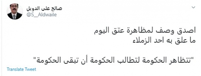 وقال في تغريدة عبر "تويتر" رصدها "المشهد العربي": "أصدق وصف لمظاهرة عتق اليوم ما علق به أحد الزملاء تتظاهر الحكومة لتطالب الحكومة أن تبقى الحكومة".
