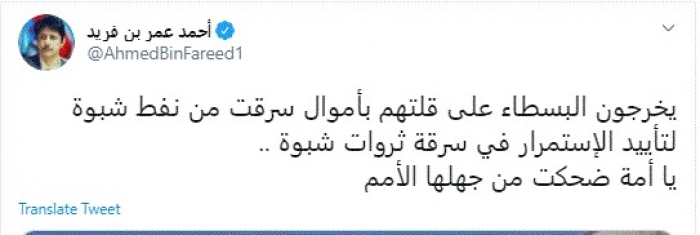 وقال في تغريدة عبر "تويتر" رصدها "المشهد العربي": "يخرجون البسطاء على قلتهم بأموال سرقت من نفط شبوة لتأييد الاستمرار في سرقة ثروات شبوة.. يا أمة ضحكت من جهلها الأمم".