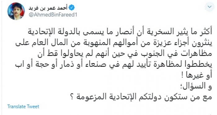 وكتب في تغريدة عبر "تويتر" رصدها "المشهد العربي": "أكثر ما يثير السخرية أن أنصار ما يسمى بالدولة الاتحادية ينثرون أجزاء عزيزة من أموالهم المنهوبة من المال العام على مظاهرات في الجنوب في حين أنهم لم يحاولوا قط أن يخططوا لمظاهرة تأييد لهم في صنعاء أو ذمار أو حجة أو اب أو غيرها".