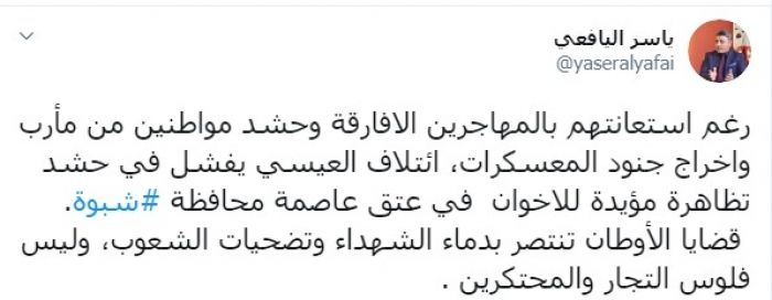 وكتب عبر تغريدة له على "تويتر" رصدها "المشهد العربي": "رغم استعانتهم بالمهاجرين الأفارقة وحشد مواطنين من مأرب وإخراج جنود المعسكرات، ائتلاف العيسي يفشل في حشد تظاهرة مؤيدة للإخوان في عتق عاصمة محافظة شبوة، قضايا الأوطان تنتصر بدماء الشهداء وتضحيات الشعوب، وليس فلوس التجار والمحتكرين".