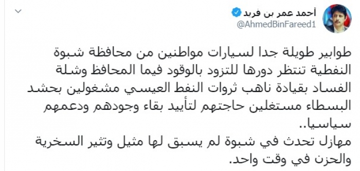 وكتب عبر تغريدة له على "تويتر" رصدها "المشهد العربي": "طوابير طويلة جدا لسيارات مواطنين من محافظة شبوة النفطية تنتظر دورها للتزود بالوقود فيما المحافظ وشلة الفساد بقيادة ناهب ثروات النفط العيسي مشغولون بحشد البسطاء مستغلين حاجتهم لتأييد بقاء وجودهم ودعمهم سياسيا، مهازل تحدث في شبوة لم يسبق لها مثيل وتثير السخرية والحزن في وقت واحد".