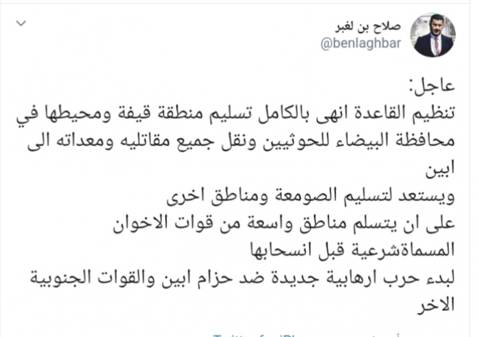 وكتب عبر تغريدة له على "تويتر" رصدها "المشهد العربي": "عاجل، تنظيم القاعدة أنهى بالكامل تسليم منطقة قيفة ومحيطها في محافظة البيضاء للحوثيين ونقل جميع مقاتليه ومعداته إلى أبين، ويستعد لتسليم الصومعة ومناطق أخرى، على أن يتسلم مناطق واسعة من قوات الإخوان المسماة شرعية قبل انسحابها، لبدء حرب إرهابية جديدة ضد حزام أبين والقوات الجنوبية الأخرى".