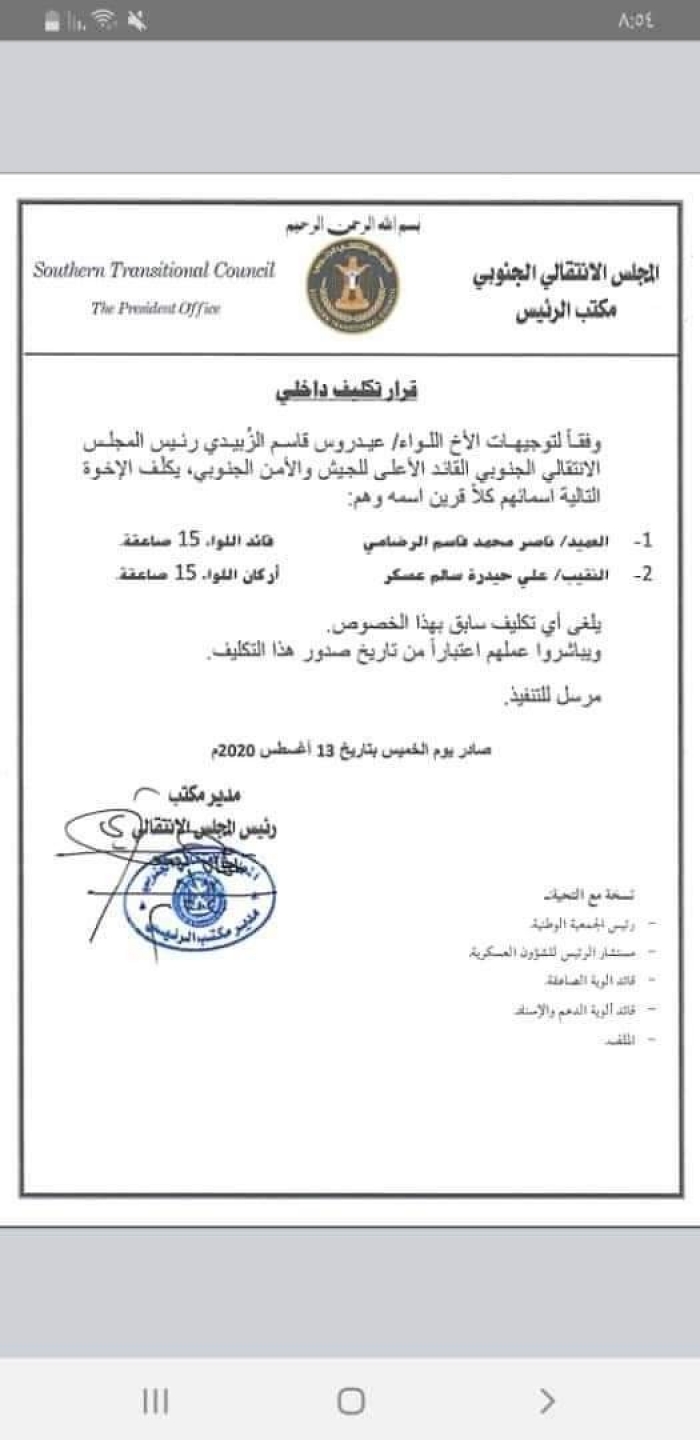 وتضمن القرار أيضًا، تكليف النقيب علي حيدرة سالم عسكر بأركان اللواء 15 صاعقة، مع إلغاء أي تكليف سابق بهذا الخصوص.