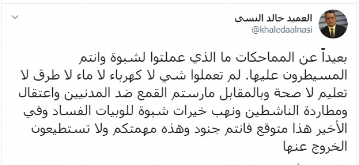 وكتب عبر تغريدة له على " تويتر" رصدها "المشهد العربي": "بعيدا عن المماحكات، ما الذي عملتوه لشبوة وأنتم المسيطرون عليها، لم تعملوا شيئا لا كهرباء لا ماء لا طرق لا تعليم لا صحة، وبالمقابل مارستم القمع ضد المدنيين واعتقال ومطاردة الناشطين ونهب خيرات شبوة للوبيات الفساد وفي الأخير هذا متوقع فأنتم جنود وهذه مهمتكم ولا تستطيعون الخروج عنها".